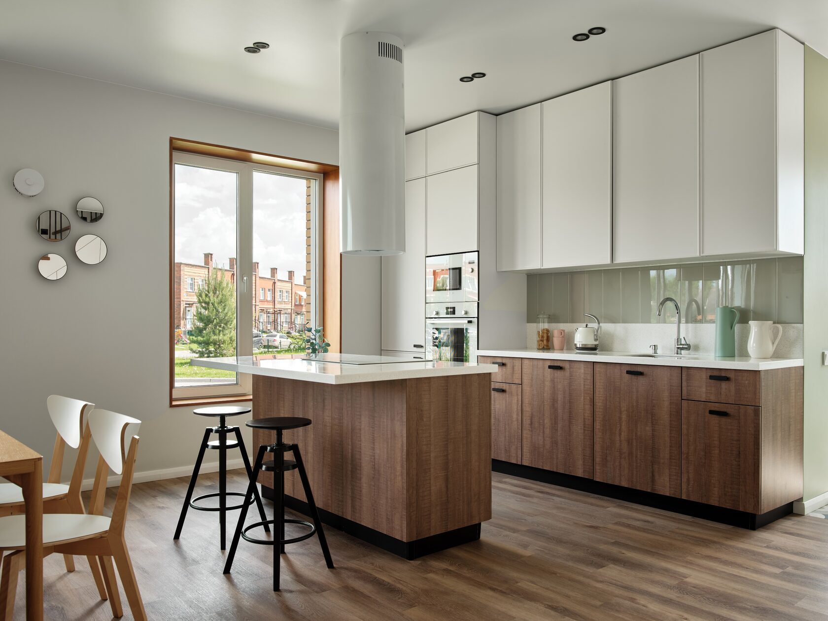 Далее важно решить вопрос хранения: высокие шкафы до потолка, выдвижные системы, скрытые ниши. Кроме того, продумайте освещение: общий свет, рабочая подсветка над столешницей и более мягкий свет над обеденным столом. В результате кухня будет и функциональной, и визуально цельной, особенно если поддержать выбранный стиль во всём первом этаже.