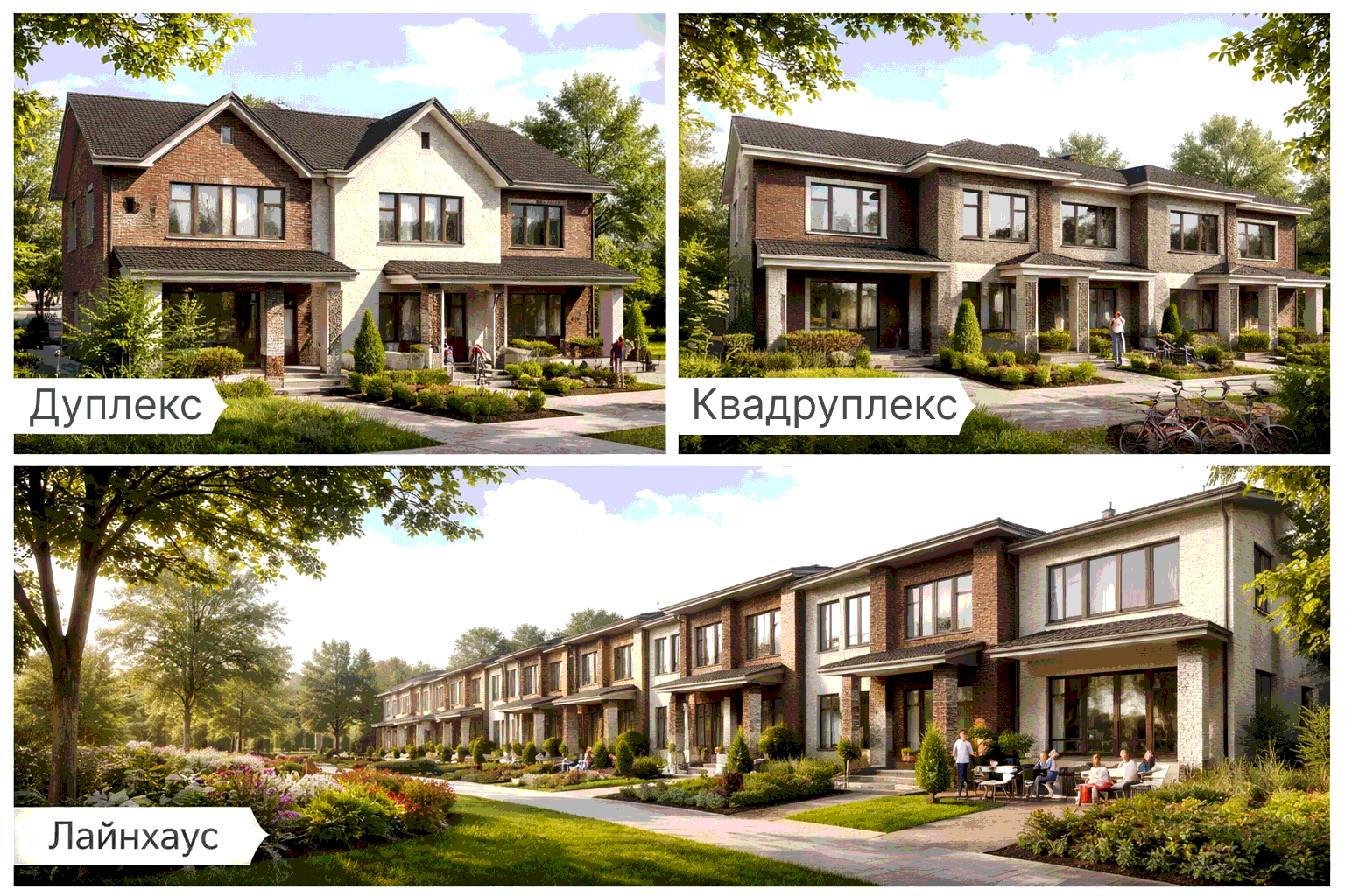 Все три формата — это разновидности таунхауса. Разница заключается в количестве секций и уровне приватности. В дуплексе две секции, в квадруплексе — четыре, в лайнхаусе — несколько секций, выстроенных в линию. Следовательно, различается плотность соседства и площадь придомовой территории.